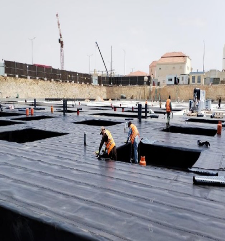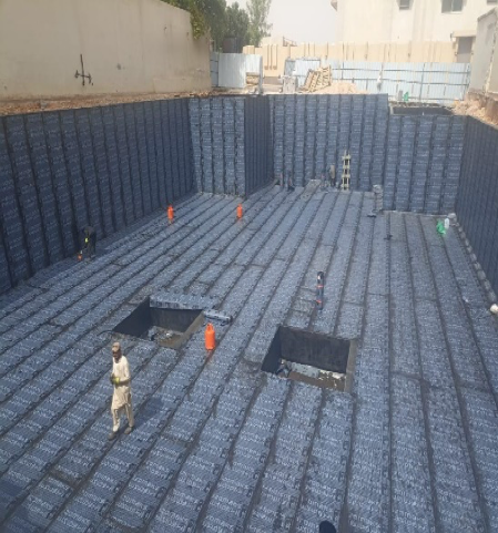 تنفيذ عزل متكامل للقبو والخزانات باستخدام البيتومين المسلح وتطبيق نظام الإيبوكسي لمواقف السيارات .